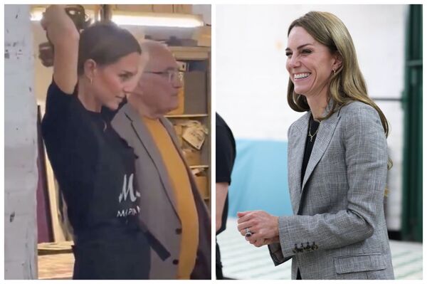 凱特王妃昨參訪紡織工坊(右圖),過程中秀一段「無髮圈綁髮神技」(左圖)。(翻攝princeandprincessofwales IG、X@RoyallyBelle_)