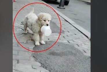 沒人照顧牠…小浪汪「叼撿來的碗」 自己四處討食超乖巧